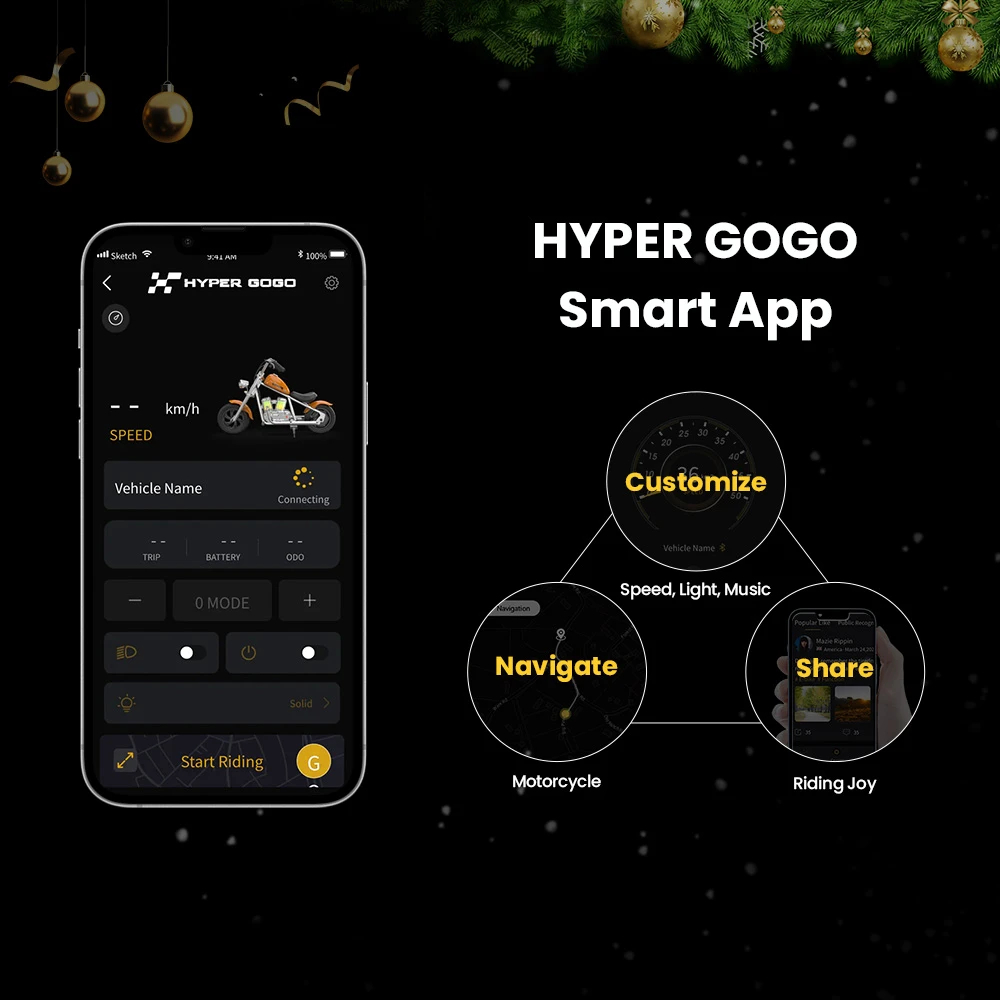 Verzija sa pametnom aplikacijom (APP) osigurava da je sigurnost vašeg djeteta na dohvat ruke. Uživajte bezbrižno i koristite pametne opcije promjene boje svjetala, nivoa brzine i muzike u bilo kojem trenutku, te pružite svom djetetu nezaboravnu vožnju bez brige. Putem nje možete pratiti i trenutnu poziciju motocikla (navigacija) i dijeliti svoje fotografije sa putovanja u Hypergogo zajednici.